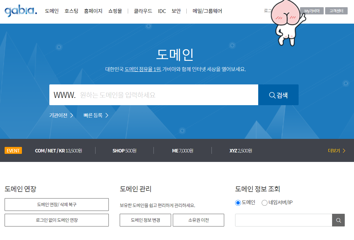 일단 먼저 도메인을 구매할 수 있는 사이트에 갑니다. 아주 간단하게 티스토리와 연결하기 위해선 저는 가비아를 추천드립니다. 사실 도메인은 어디에서 사도 상관없지만 티스토리와 간편하게 연결하기 위해서입니다.