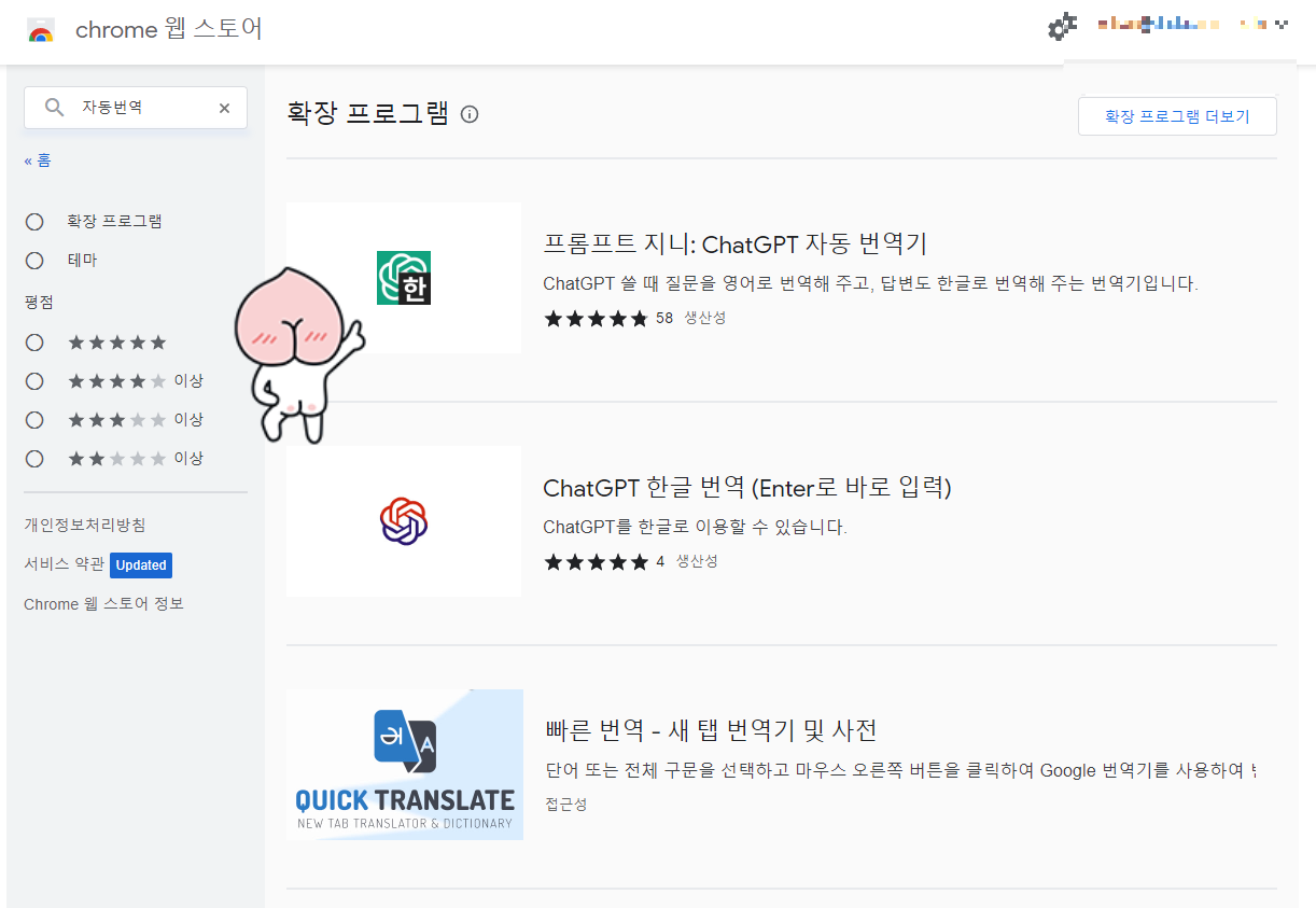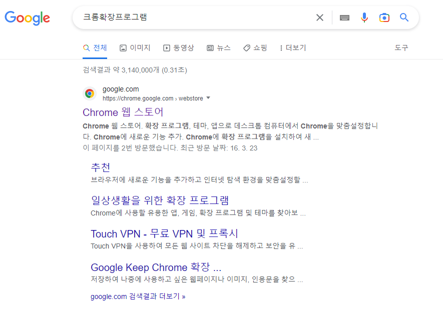 1. 크롬 웹 스토어에 접속합니다. (검색창에 크롬웹스토어 또는 크롬확장프로그램입력)